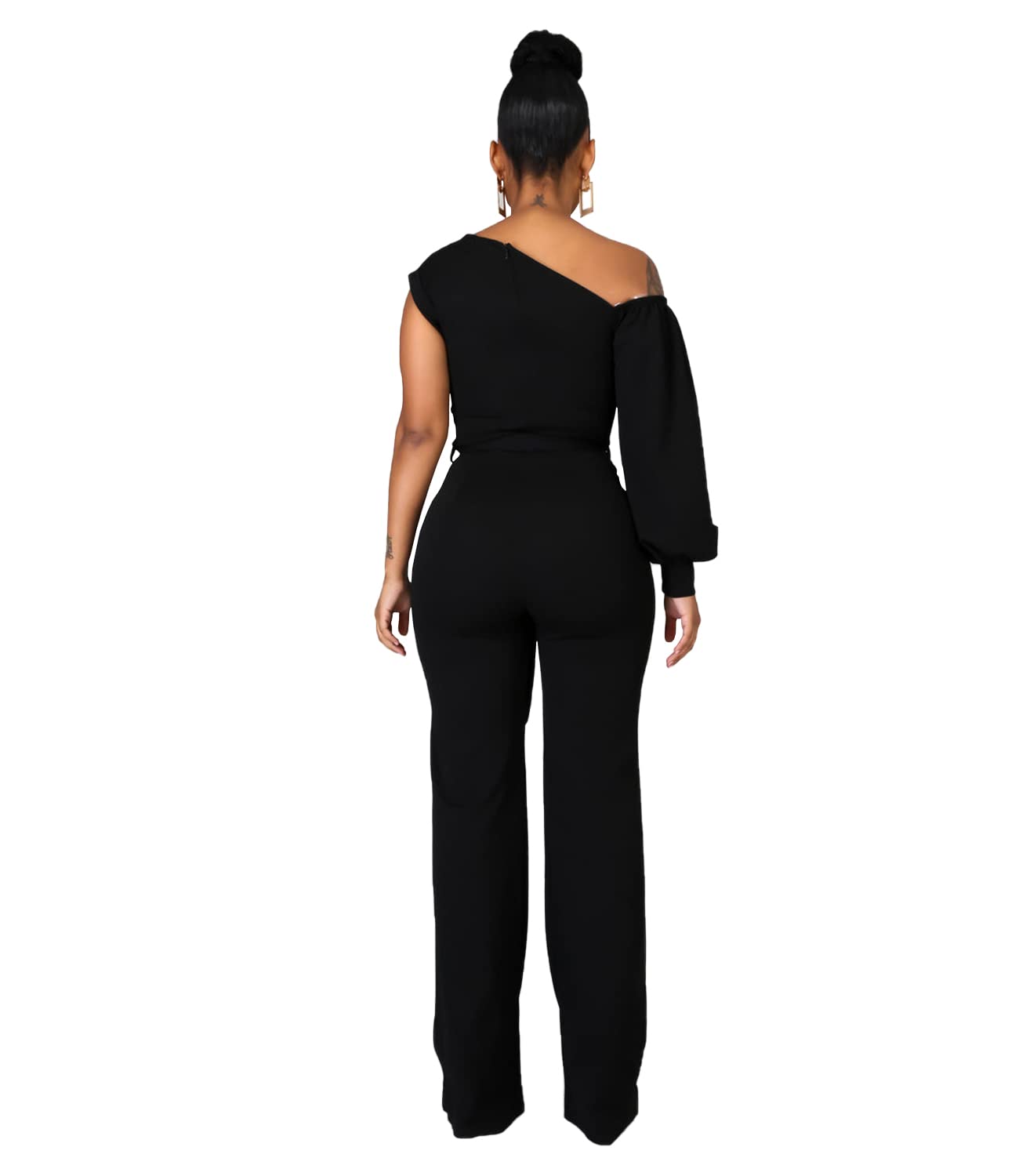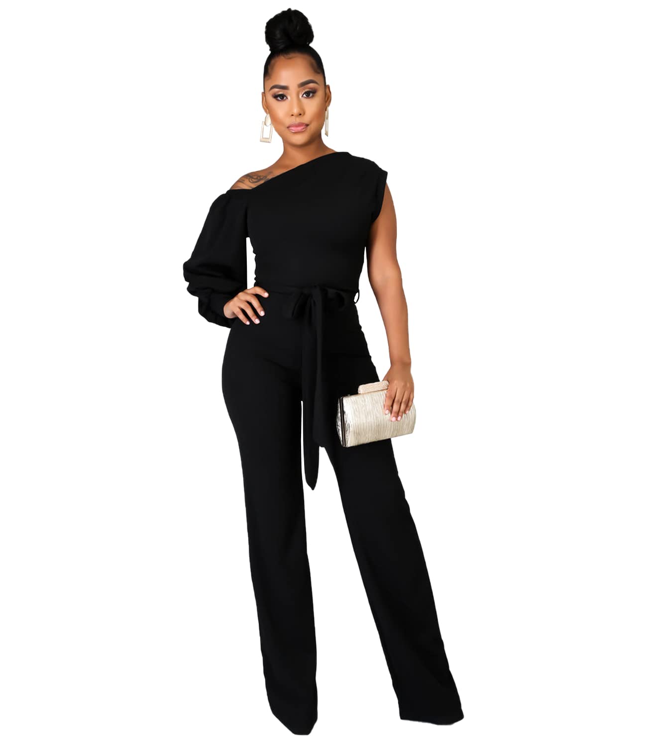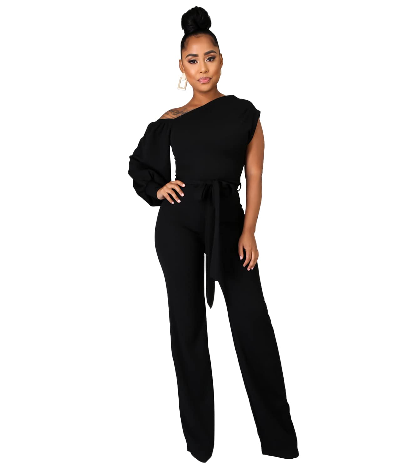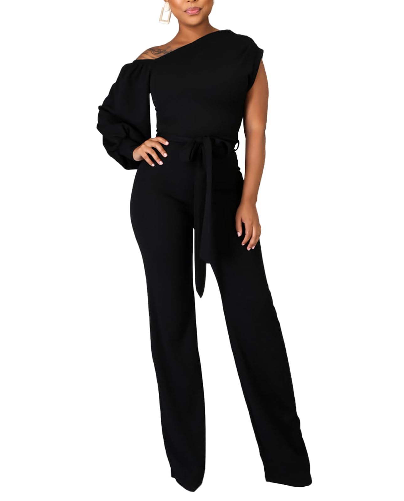 • Elegant Sexy Solid Color Slanted Shoulder High Waist Belted Club Party Cocktail Jumpsuit