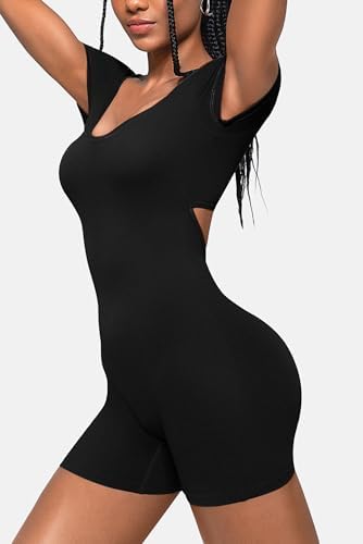 • 【4-Way Stretchy Fabric】Our cute short-sleeved jumpsuit for women is made of buttery soft yet compressive seamless knit fabric. It is moisture-absorbing, non-see-through, and fits like a glove. The skin-friendly material offers light tummy control and is very comfortable to wear.