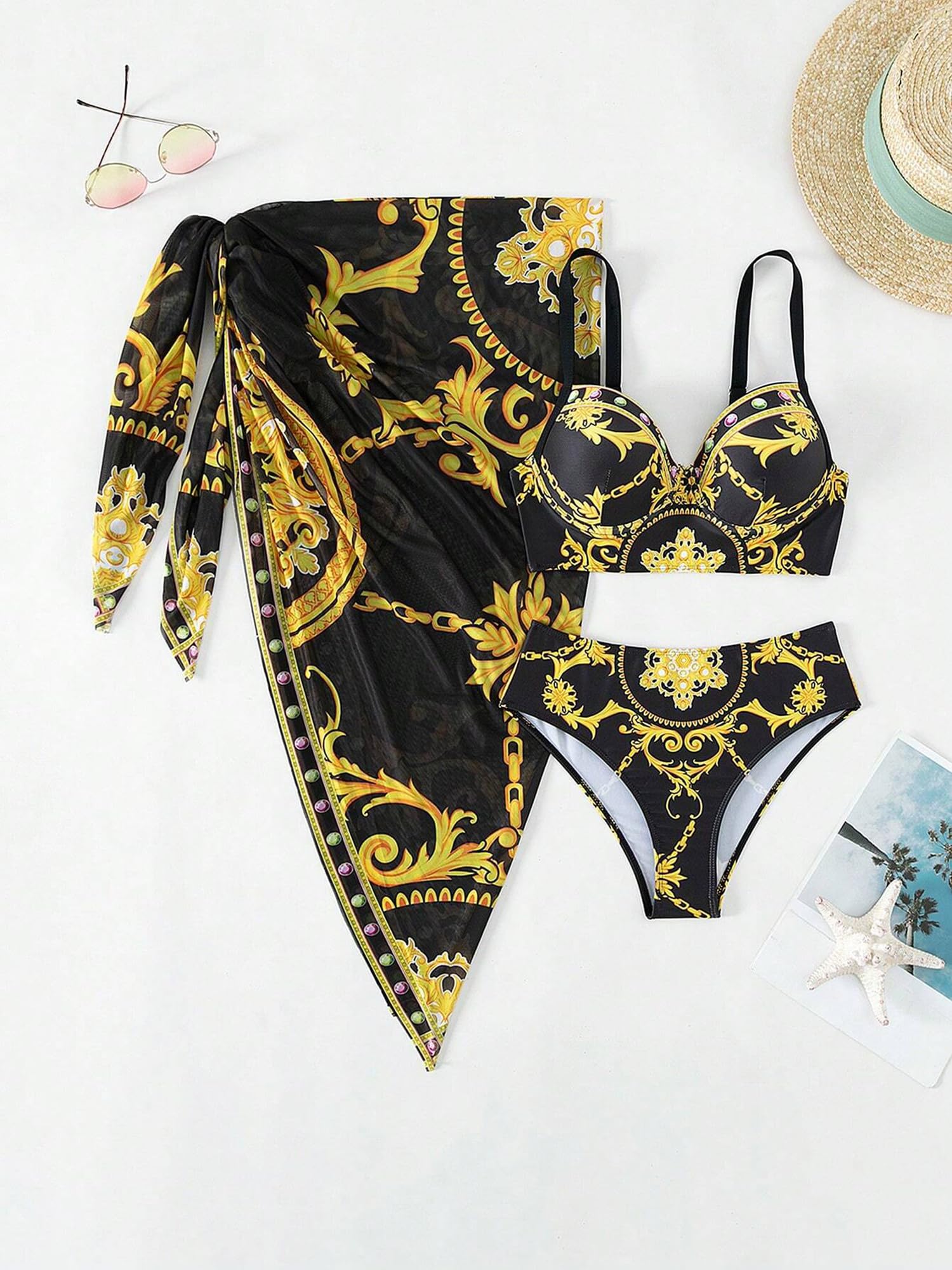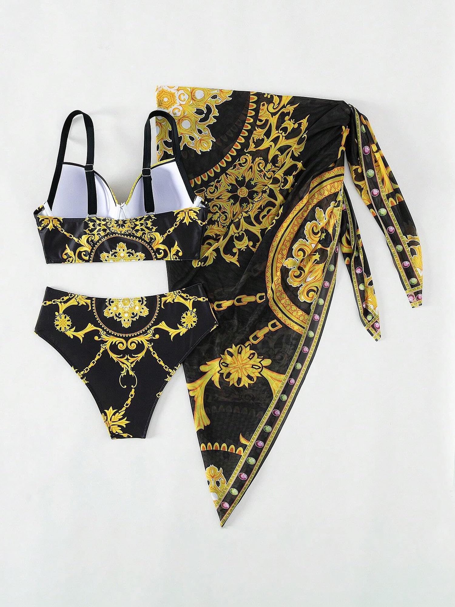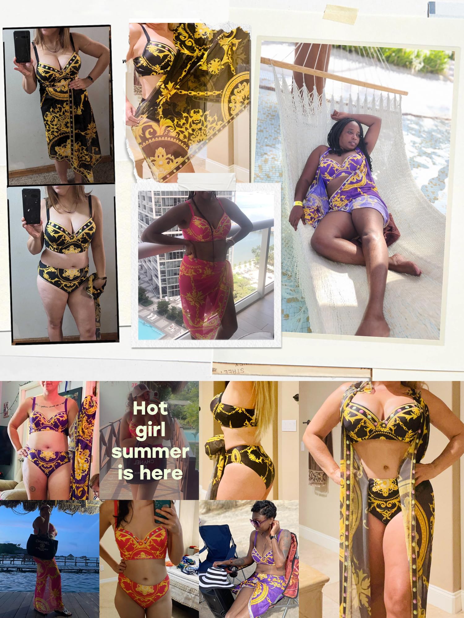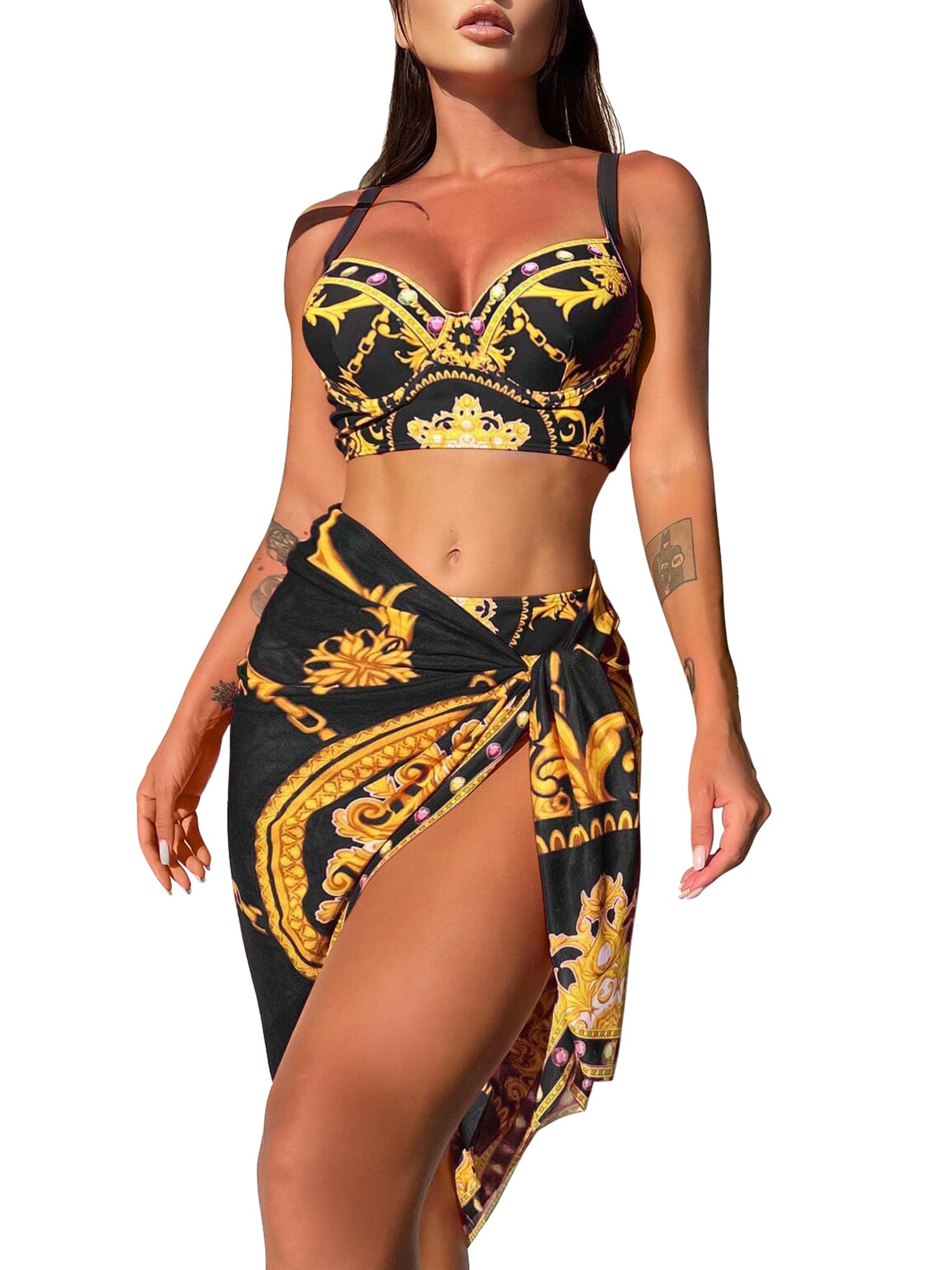 Details: Elevate your beach style with our 3-piece swimsuits featuring a self-tied wrap cover-up skirt that can be worn as a stylish cover-up or draped over your shoulders for added flair on cool vacation nights. Embrace Bohemian elegance with intricate Bohofeel chain prints, adding nobility and grace to your beachwear collection. The push-up bra, featuring non-removable soft padding and a supportive underwire, provides a confidence boost while the wrap-around swimwear ensures excellent coverage and conceals your tummy for ultimate comfort, shaping a chic and slim silhouette. Crafted from 80% Polyamide and 20% Elastane, our premium fabric offers a super-soft, lightweight, and fast-drying experience. Ideal for various summer occasions, including family pool days, cruises, beach parties, tropical vacations, water play, Hawaii getaways, honeymoons, spa retreats, solarium lounging, and basking in the sunshine. Upgrade your tropical wardrobe with this chic and functional swimwear ensemble.
