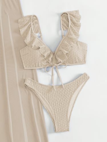 Verdusa Women's 3 Piece Ruffle Trim V Neck Bikini Sets Swimsuit with Cover Up Skirt Apricot X-Large