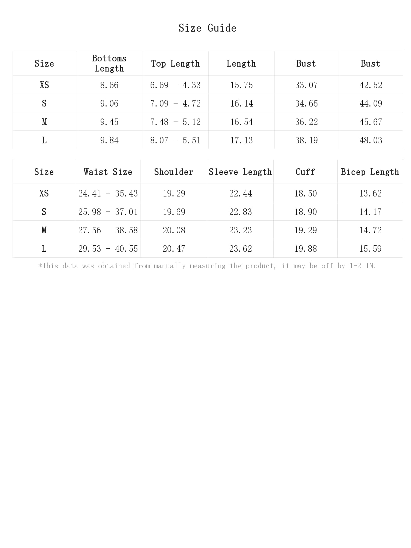 XS:Bottoms Length:8.7IN,Waist Size:24.4-35.4IN,Bust:33.1IN,Top Length:6.7/4.3IN,Bicep Length:13.6IN,Bust:42.5IN,Cuff:18.5IN,Length:15.7IN,Shoulder:19.3IN,Sleeve Length:22.4IN