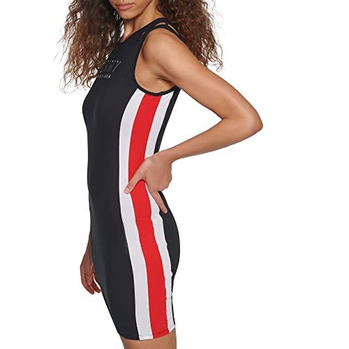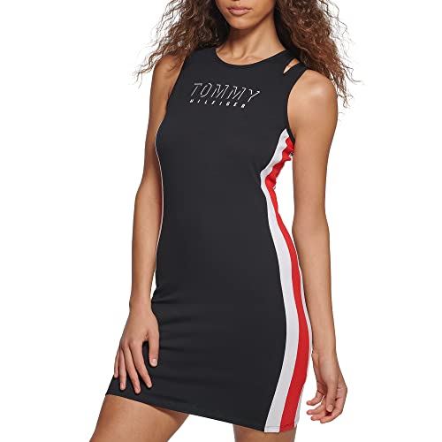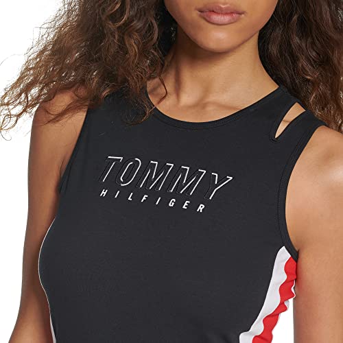 Details: This Tommy Hilfiger womens Sport Dress is a bodycon fit tank dress shoulder cutout side panel color blocking chest graphic