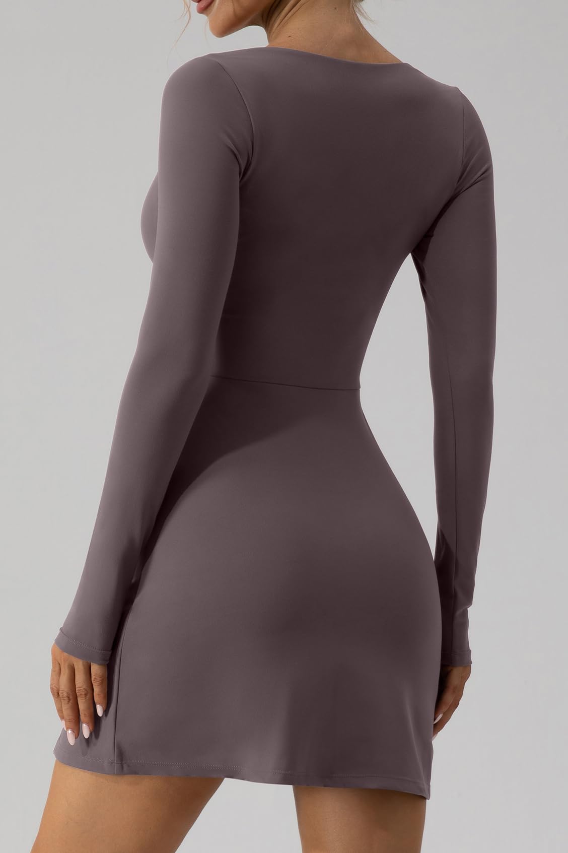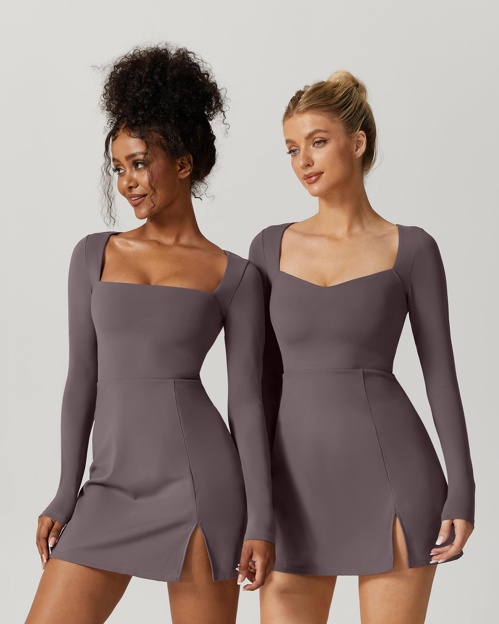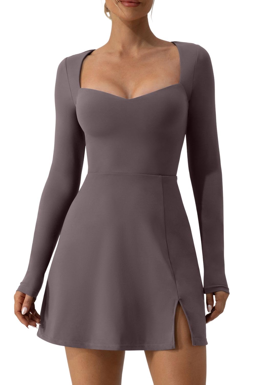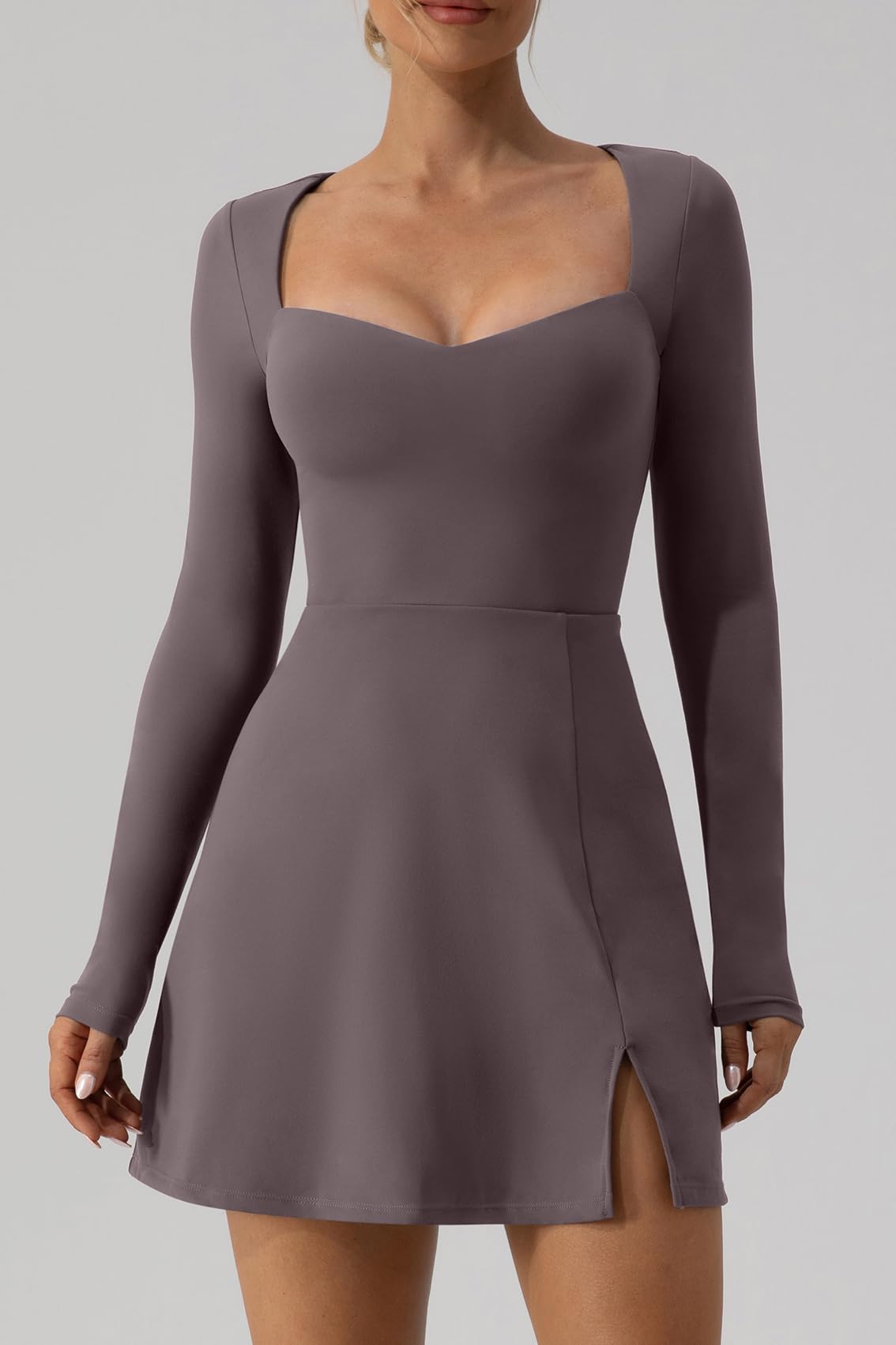Details: QINSEN Women's Sweetheart Neckline Long Sleeve Dress Side Slit Stretch Flare Mini Dress
