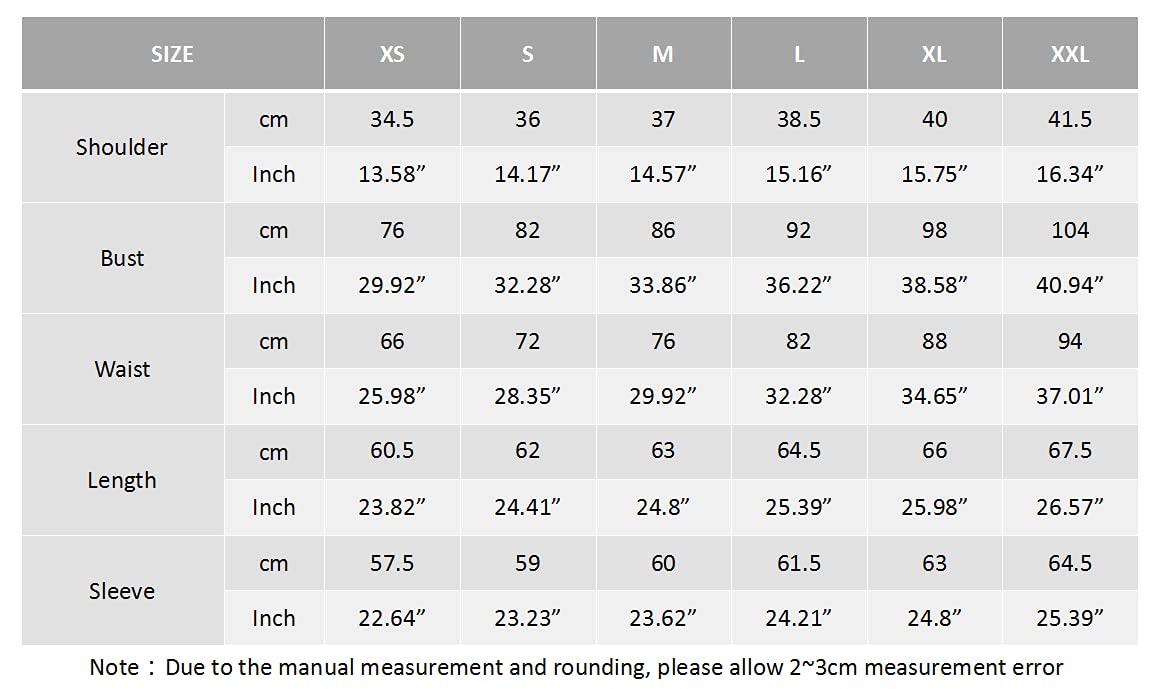 Details: We are committed to providing our customerswith the most cost-effective clothing. We have carefully selectedskin-friendly, durable and sustainable materials to keep up with trends anddevelop better-looking styles. We are gaining price advantage byintegrating our supply chain and removing brand premiums. We want to offerbetter fabrics and services at lower prices in this difficult economicenvironment. Please stay tuned! Size Chart(INCH): X-Small: Shoulder 13.78'' Waist 26.77'' Bust 31.5'' Length 24'' Sleeve 22.44'' Small: Shoulder 14.17'' Waist 28.35'' Bust 33.07'' Length 24.4'' Sleeve 22.84'' Medium: Shoulder 14.57'' Waist 29.92'' Bust 34.65'' L ength 24.8'' Sleeve 23.23'' Large: Shoulder 14.96'' Waist 31.5'' Bust 36.22'' L ength 25.2'' Sleeve 23.62'' X-Large: Shoulder 15.35'' Waist 33.07'' Bust 37.8'' Length 25.6'' Sleeve 24.02'' Please refer to the sizing chart in thepicture area for details. Please note that there may be colordifferences between monitors, so the actual color of the item may be slightlydifferent from that shown on the monitor. Thanks for your understanding : )