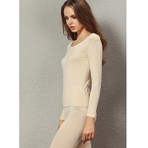 Liang Rou Women's Crewneck Long Johns Ultra Thin Modal Thermal Underwear Top & Bottom Set Apricot Medium
