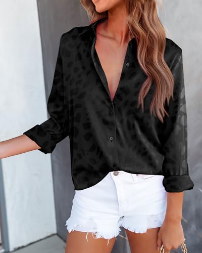 BTFBM Women's Satin Button Down Shirts Roll Up Long Sleeve Lapel V Neck Loose Casual Work Summer Fall Blouse Tops 2023(Leopard Black, X-Large)