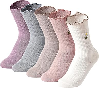 Womens Ruffle Socks High Ankle Casual Knit Dress Sock Fashion Women Princess Socks Cute Embroidery 5 Pairs