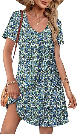 OFEEFAN Summer Dresses for Women 2025 Loose V Neck Short Sleeve Casual T Shirt Dress Sundresses Swimsuit Coverup with Pockets