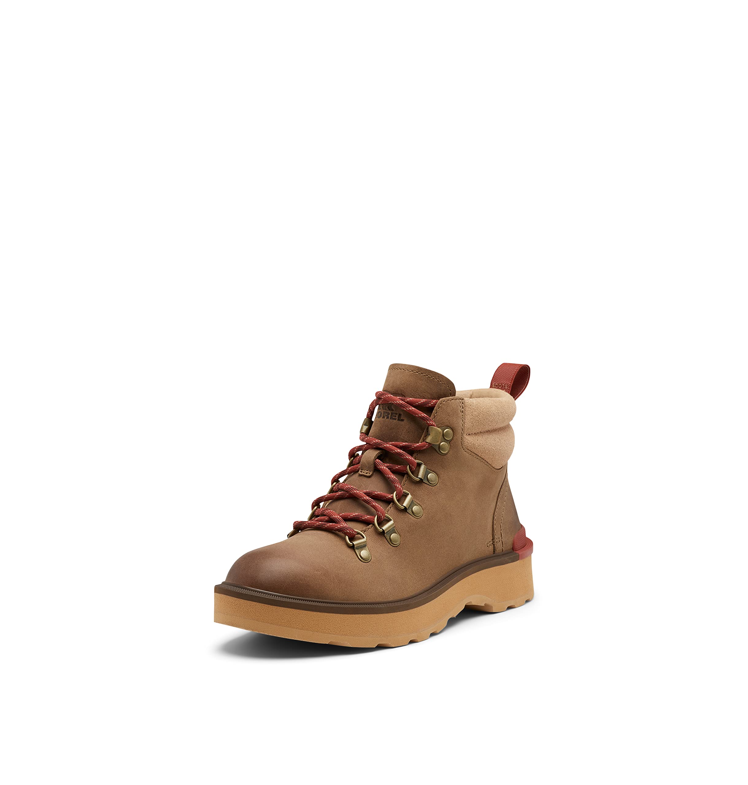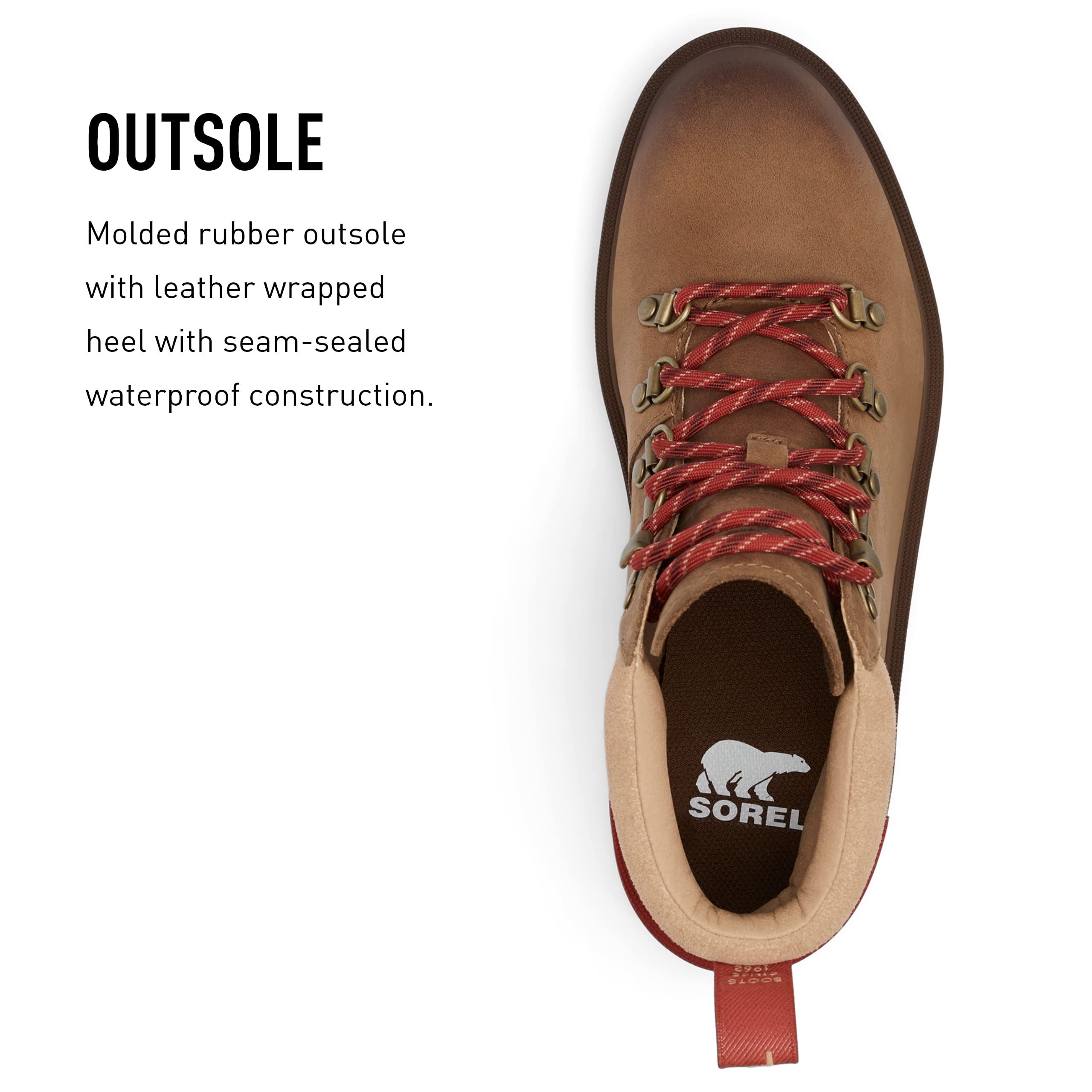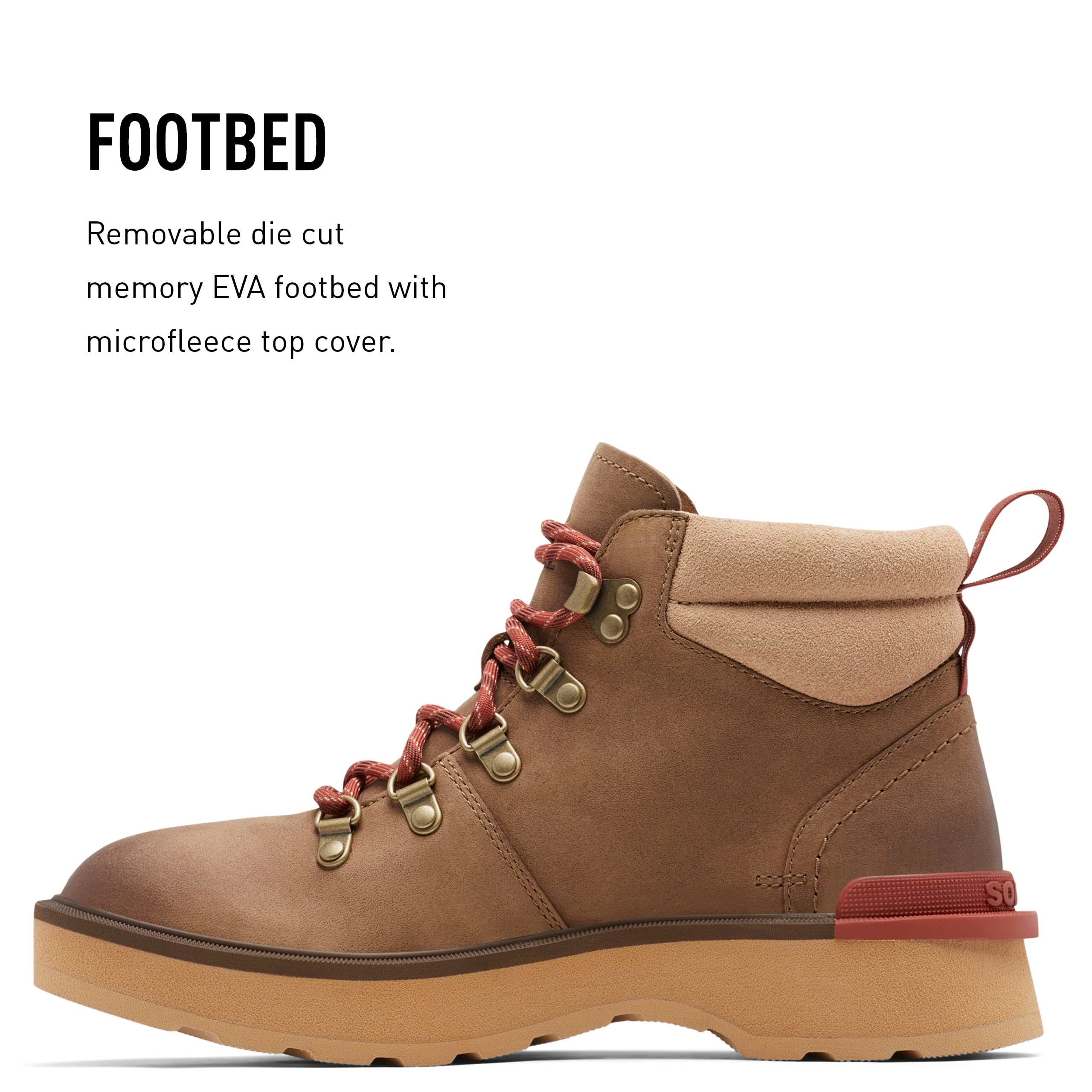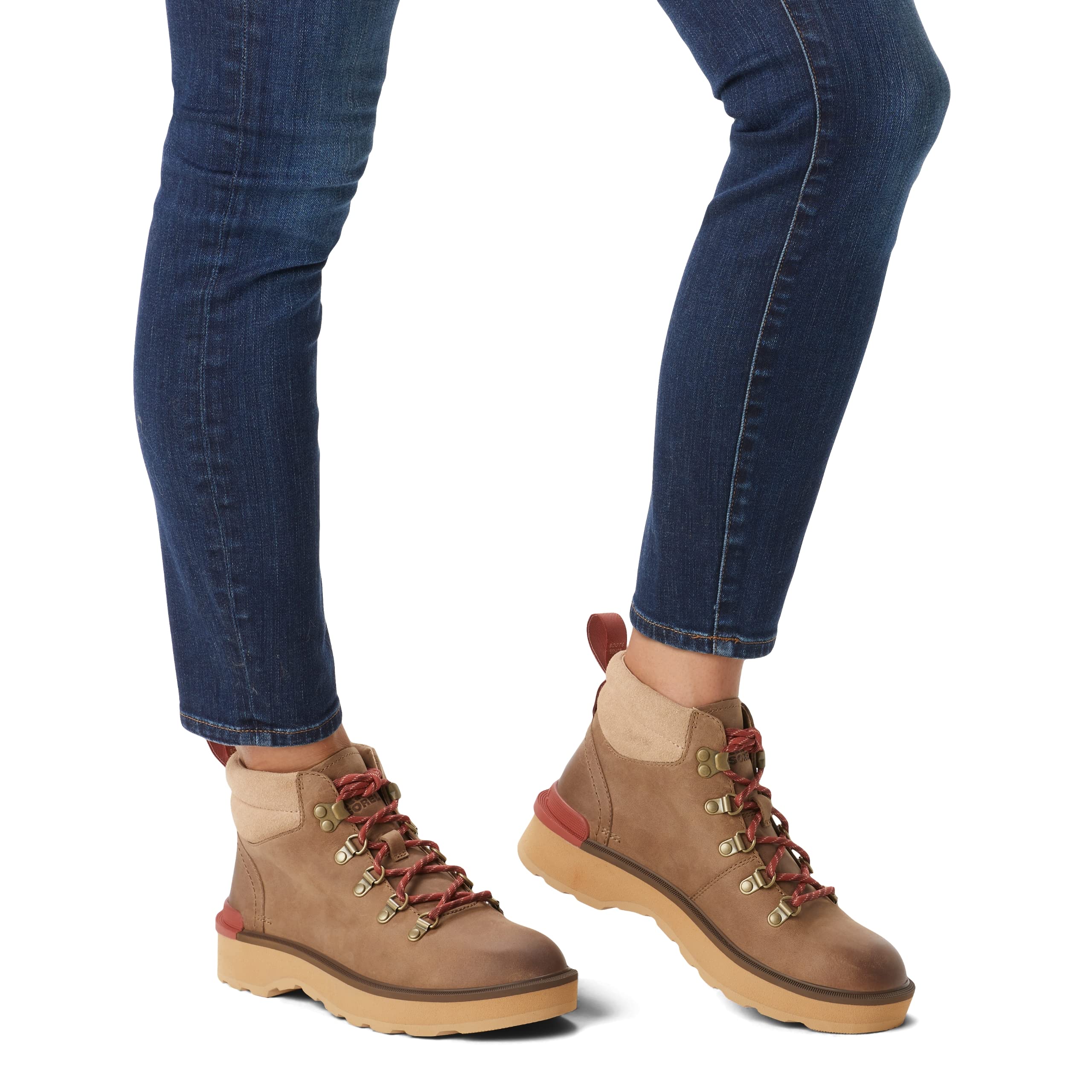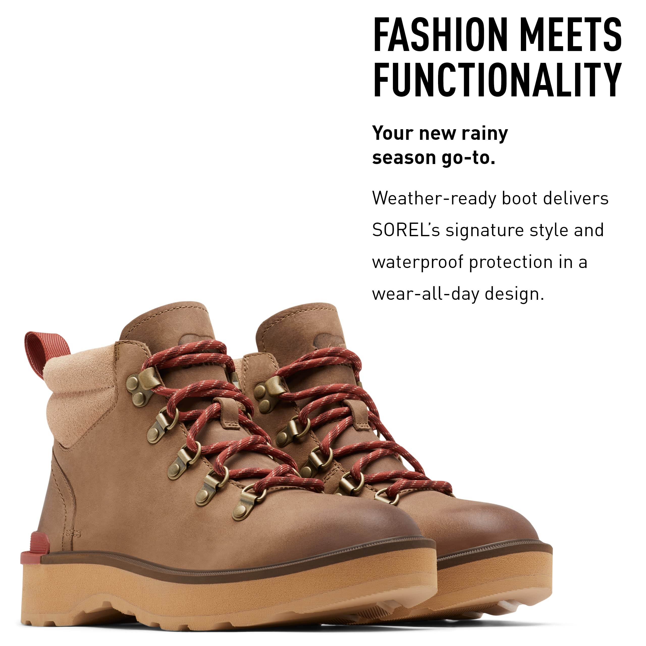 Details: This women's hiking boot is grounded by a lightweight but sturdy sole that will see you through it all, season after season. LEATHER CARE GUIDE The city is unpredictable, and acquiring scuffs, nicks, and dirt along the way is inevitable. We wanted to provide you with a guide on how to care for your leather—so you can keep that fresh-out-of-the-box look for as long as possible. FOR WATERPROOF LEATHER: Step 1: Use a medium-bristle brush to remove dirt, dust, or debris (we recommend one made specifically for cleaning leather.) Step 2: Wipe shoes with a damp cloth. Step 3: Let dry in a cool, dry place. FOR OILED LEATHER/DRY-TANNED LEATHER: Step 1: Remove dirt, dust, or debris, with a dry cloth. Step 2: Use a clean cloth dipped in a bit of leather cleaner all over shoes. Step 3: Wipe shoes with a damp cloth to remove residue. Step 4: Let dry in a cool, dry place. FOR NUBUCK/SUEDE LEATHER: Step 1: Use a soft brush to remove dirt, dust, or debris (we recommend one made specifically for nubuck/suede leather.) *Note: leather is a natural product and will have its own unique characteristics, marks, or imperfections. Some leather may have color variations, small markings or scratches. These are a natural part of the character and don't affect the quality or durability of the leather. Founded in 1962, SOREL combines expert craftsmanship and of-the-moment design to create all-season footwear. What began decades ago with premium boots, crafted with an unparalleled balance of construction and protection, is now a brand dedicated to both functionality and fashion. Here at SOREL, we believe you are your most powerful tool and the determination you find within is an unstoppable force. SOREL challenges the status quo by creating unexpected footwear that pushes the boundaries of function-first fashion. We stay in motion so you can push yourself forward.