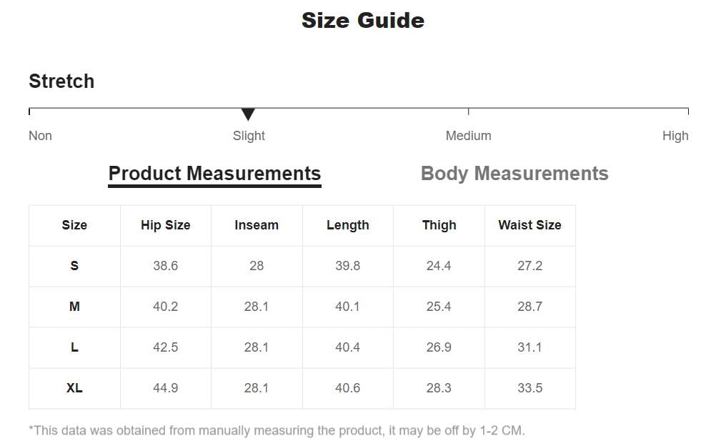 Small: Hip Size: 38.6", Inseam: 28.0", Length: 39.8", Thigh: 24.4", Waist Size: 27.2"