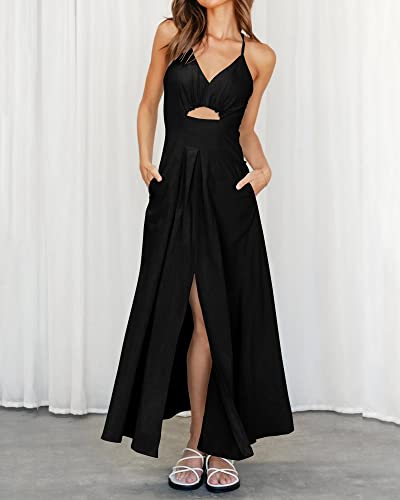 BTFBM Women 2024 Summer Spaghetti Strap Dress Sleeveless V Neck Cutout Slit Casual Beach Party Maxi Dresses with Pockets(Solid Black, Large)
