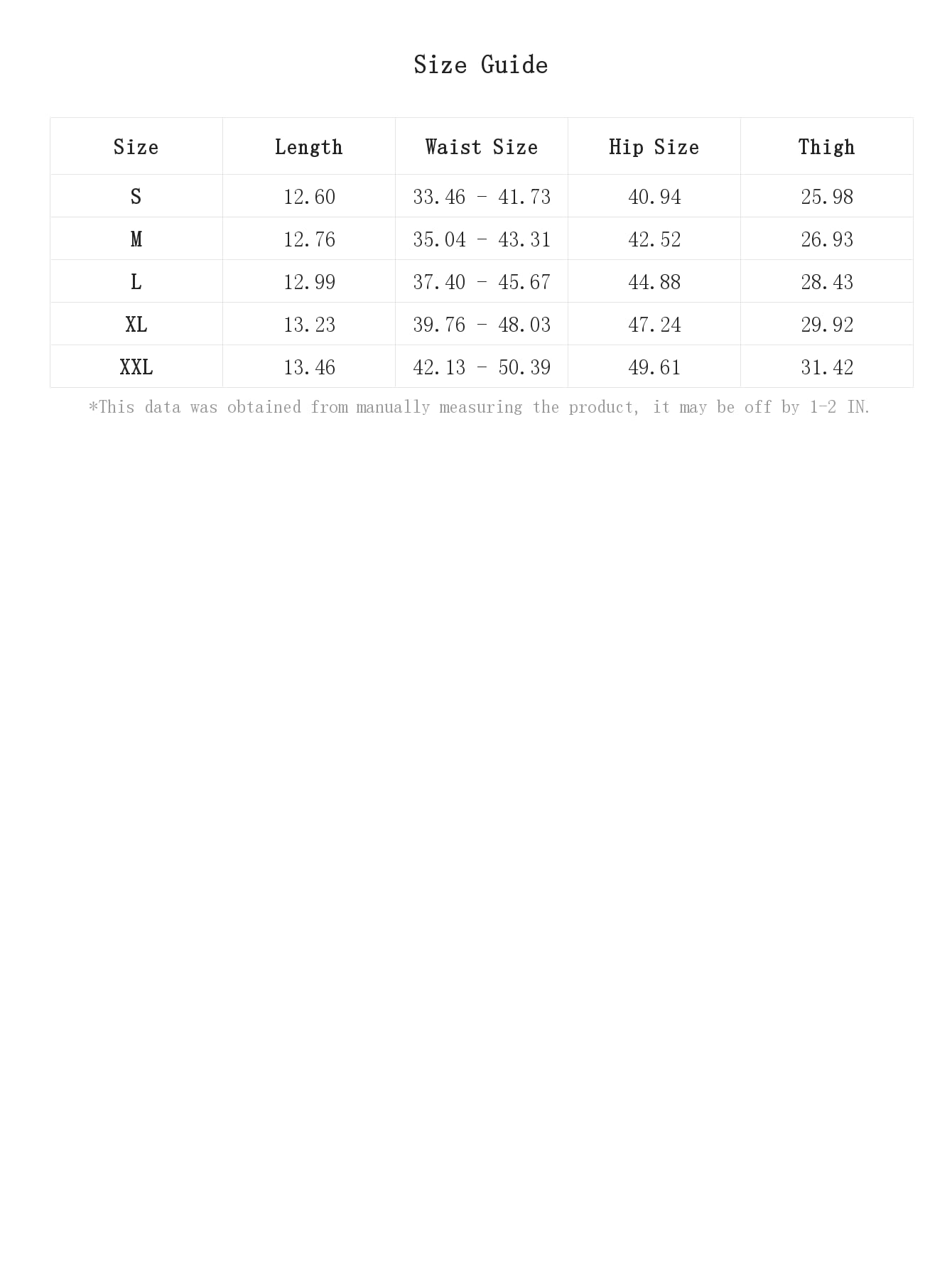 XXL:Hip Size:49.6IN,Length:13.5IN,Thigh:31.4IN,Waist Size:42.1-50.4IN