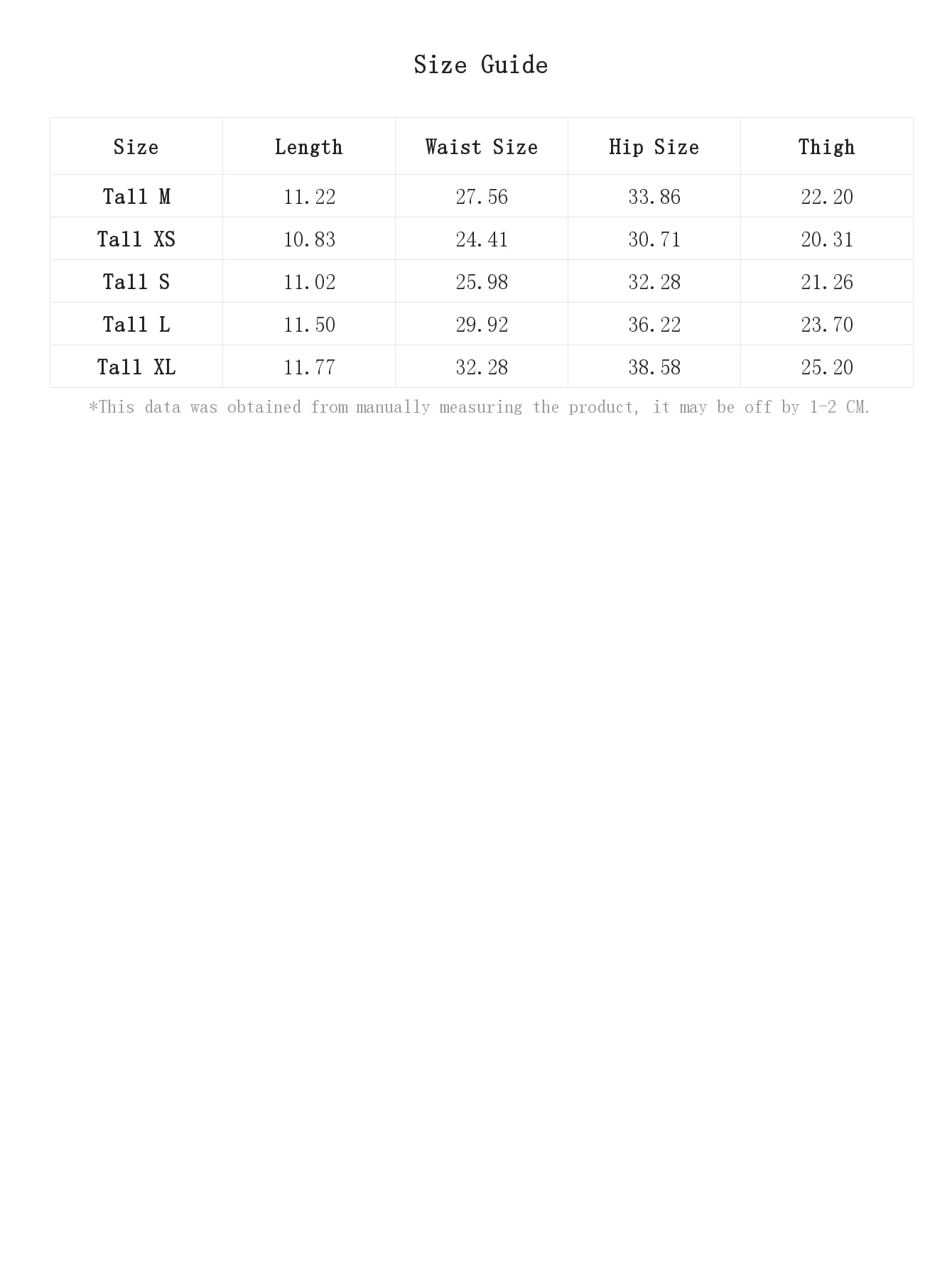 Tall XS:Hip Size:30.7IN,Length:10.8IN,Thigh:20.3IN,Waist Size:24.4IN