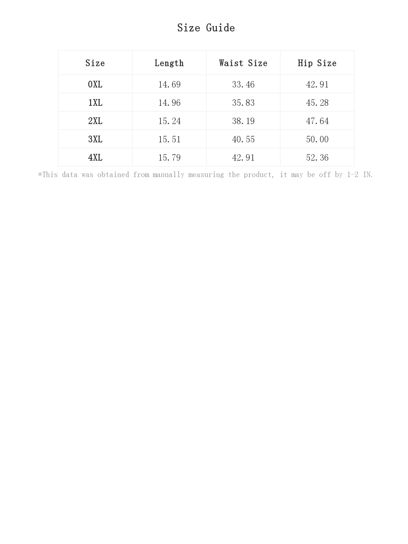 0XL:Hip Size:42.9IN,Length:14.7IN,Waist Size:33.5IN