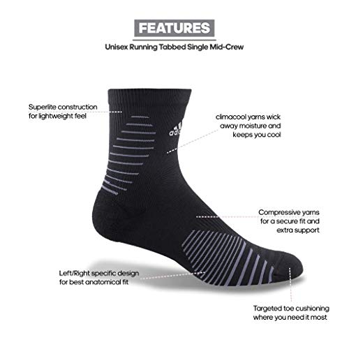 Details: The new adidas running mid-crew sock was designed with best in class technical performance attributes. designed to wick away moisture and ventilate through mesh on top of the foot. cooling nylon yarns provide a smooth ride and ultimate comfort for longer runs. with all over compression, you have a secure, snug fit inhibiting any friction or blistering while running. anatomically designed with a left/right specific design.
