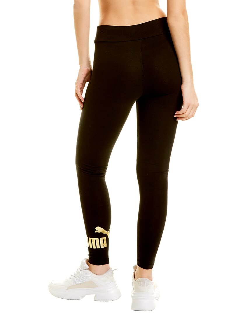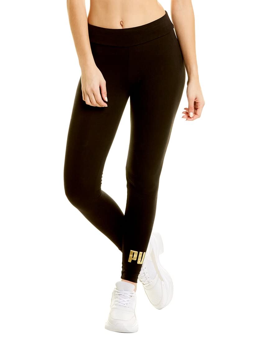 Details: Whether you're laying low or working in the next training session, the PUMA® Essentials+ Metallic Leggings will keep you comfortable no matter the activity. Banded waistband with pull-on styling. Athletic fit. Ankle length. Metallic brand wordmark and logo at left ankle. 95% cotton, 5% elastane. Machine wash cold, tumble dry low.