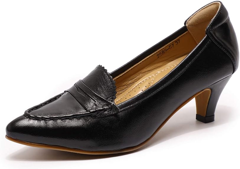 Mona flying Women's Leather Pump Med Heel Pointed Toe Office Dress Shoes for Ladies
