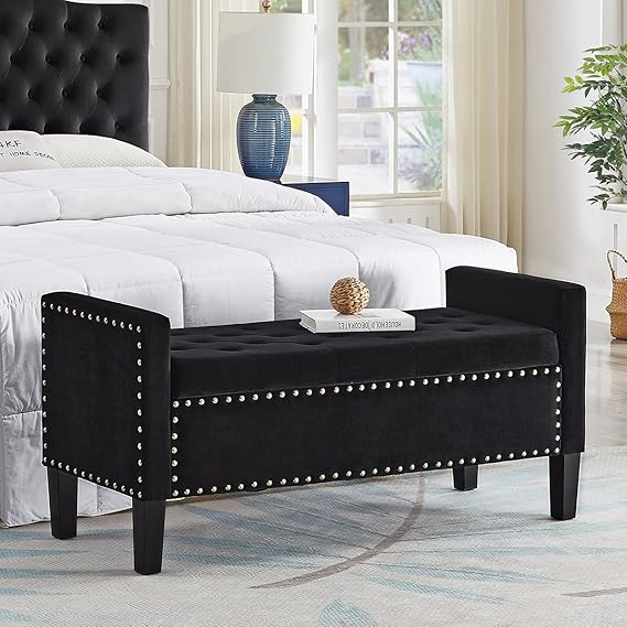 24KF Velvet Modern Upholstered Tufted Button Storage Bench with Arms for Bedroom, Entryway Living Room Soft Padded Seat-Black