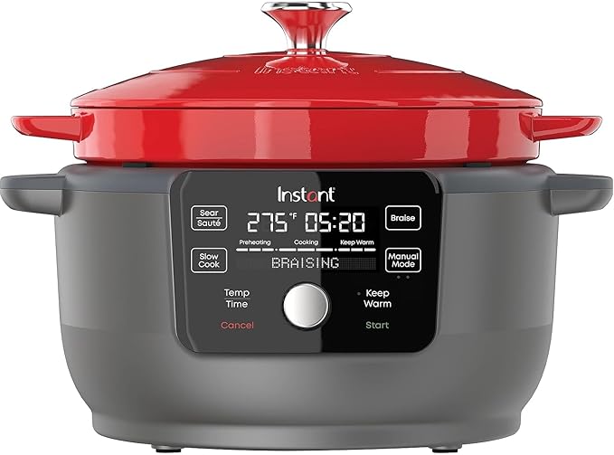 6-Quart 1500W Electric Dutch Oven with Recipe Book - Braise, Slow Cook, Sear, Warm, Red Enameled Cast Iron