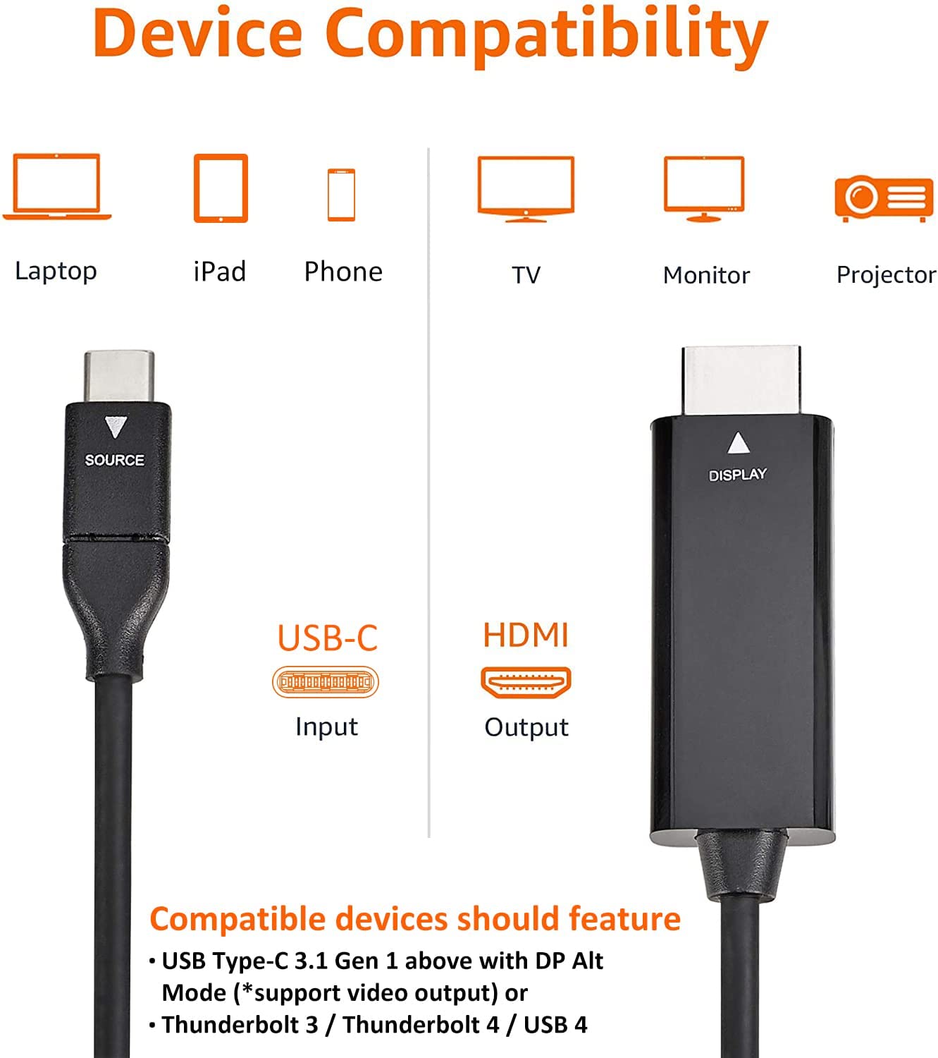 Amazon Basics USB-C to HDMI Cable Adapter (Thunderbolt 3 Compatible) 4K@30Hz - 3-Foot