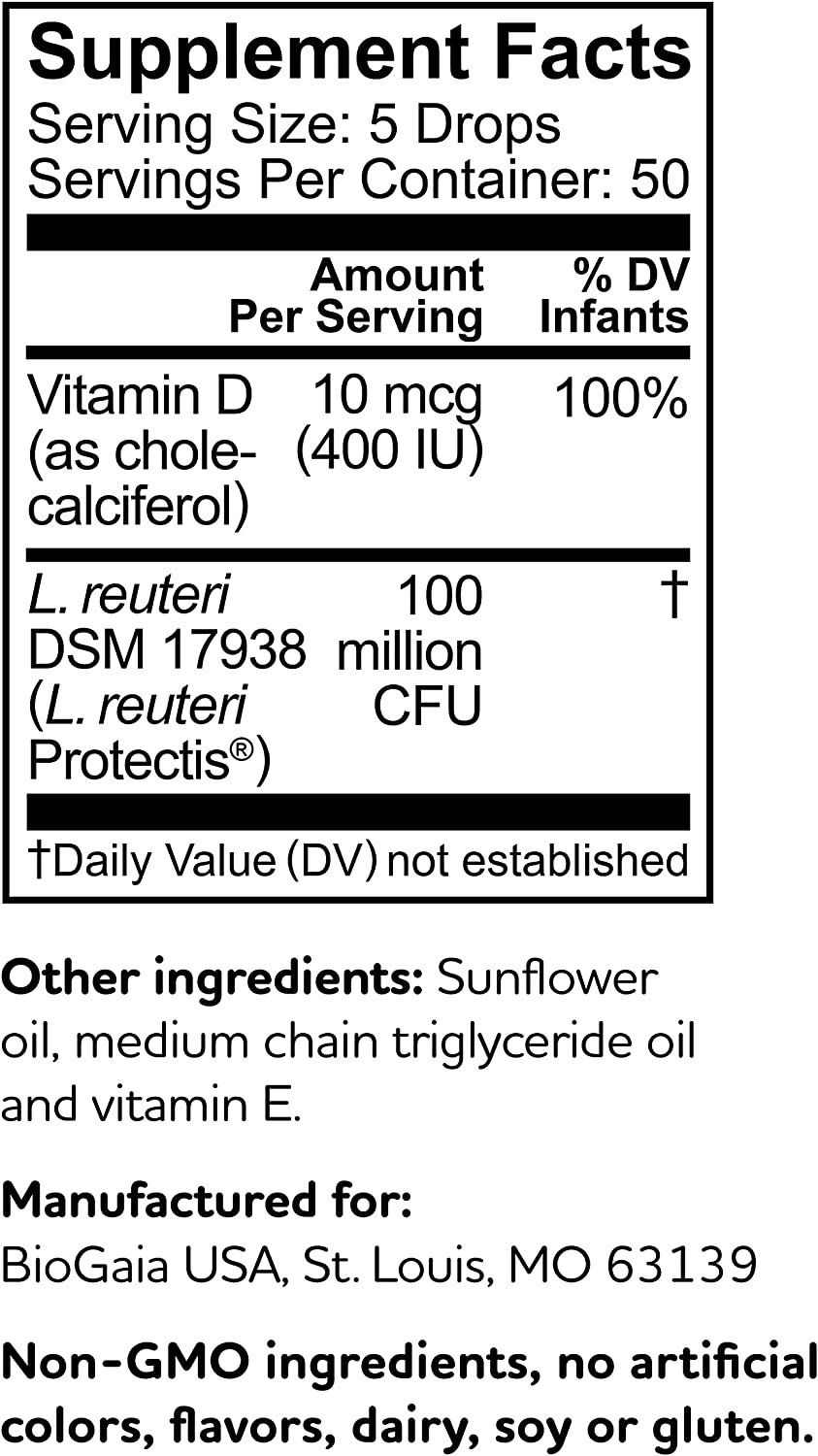 • Just 5 drops daily with an easy dropper tube contains 100 million live L. reuteri probiotics, clinically shown to reduce crying and fussing in colicky infants
