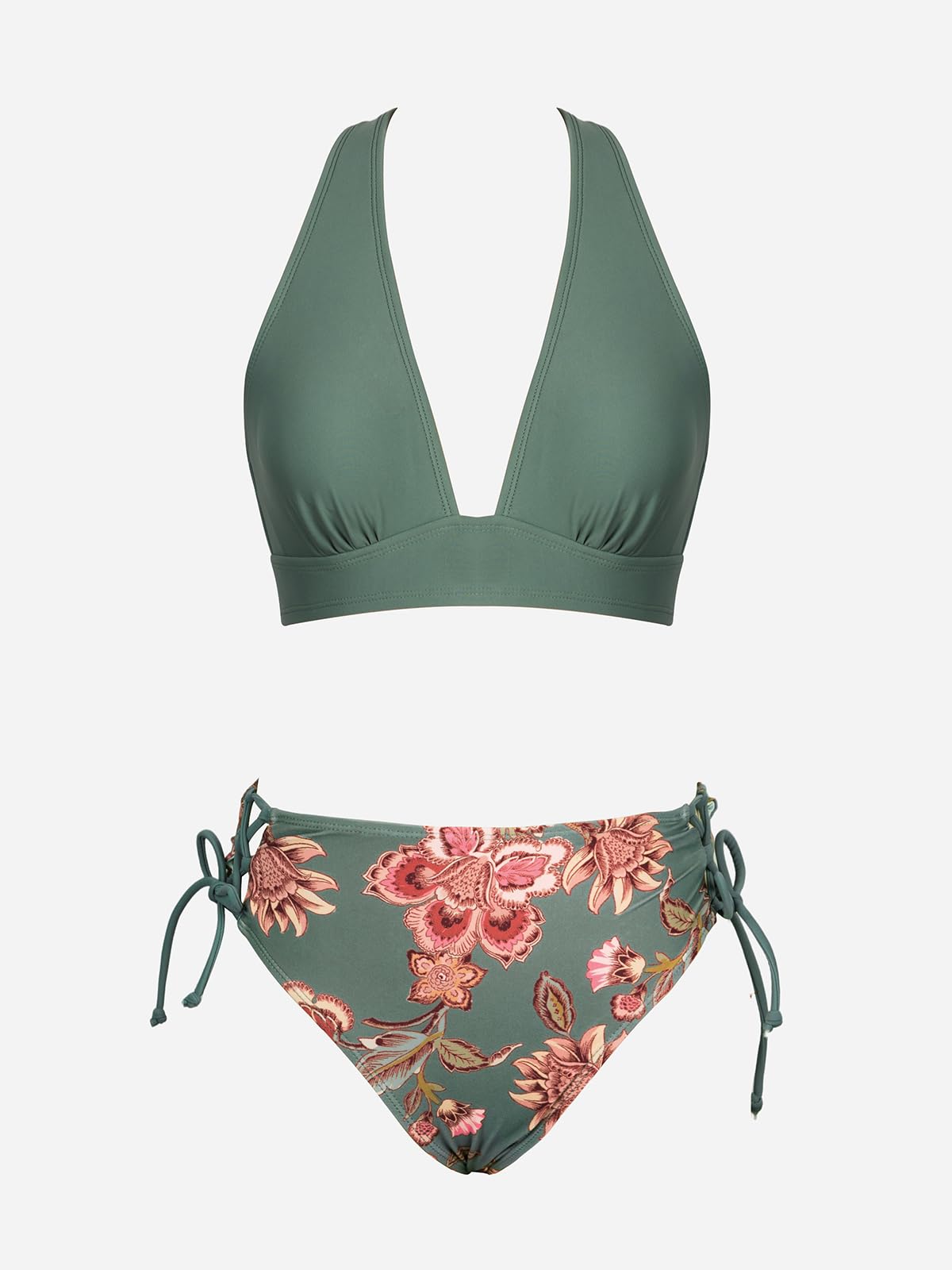 • Design: Splash and play all day in this bikini set featuring a top with a triangle silhouette, plunging v neck, and wide straps that form a crisscross back, as well as a matching pair of hipster bottoms with a mid rise waist and adjustable lace up sides. About Cup Style: With Removable Soft Cups.