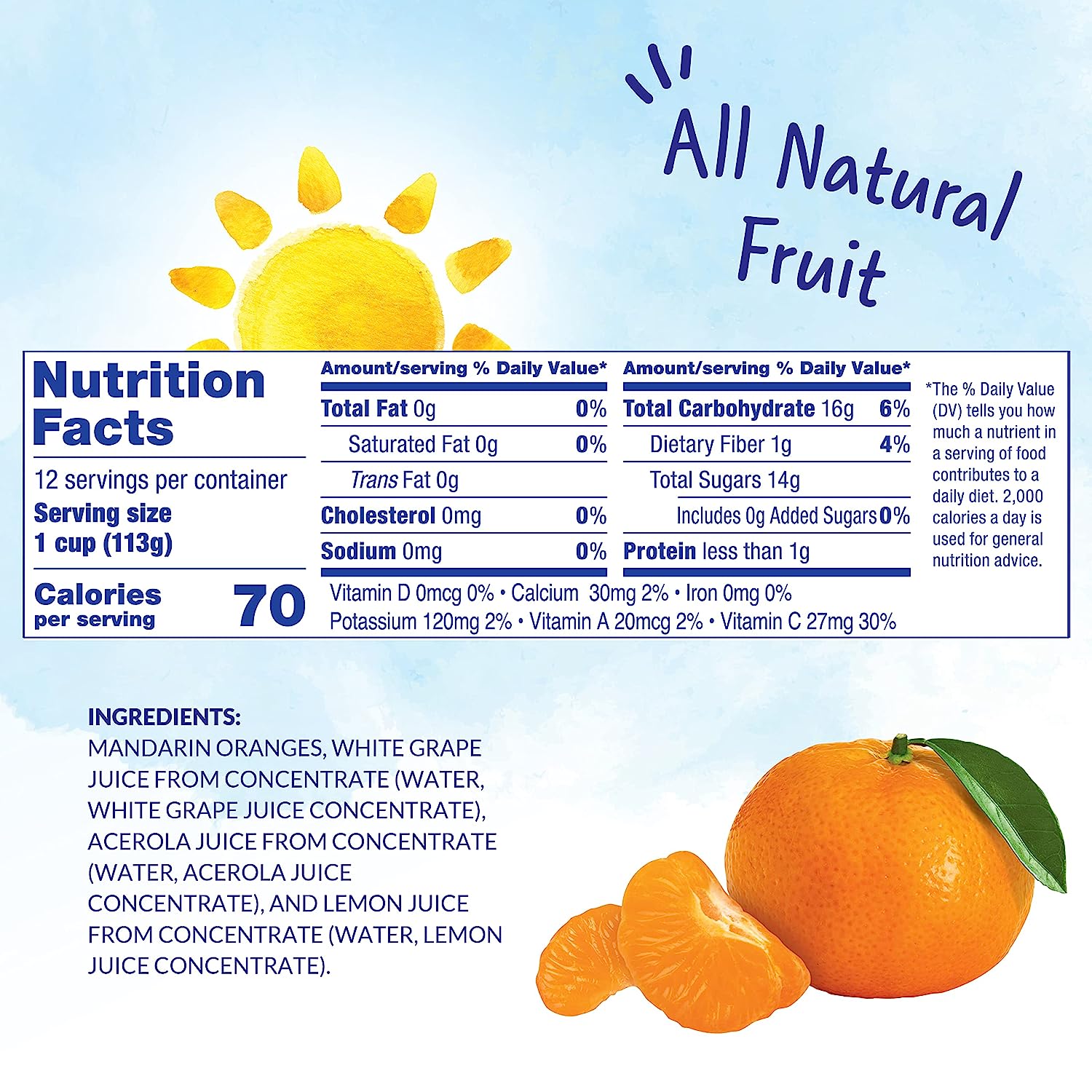 Founded in Hawaii in 1851, Dole is the world's largest producer and marketer of high-quality fresh fruit and fresh vegetables. The Dole brand means the finest, high-quality products. Dole will continue to meet customers' expectations by consistently providing products that meet the highest standard - the Dole standard. Dole is focused on four pillars of sustainability in all of its operations: water management, carbon footprint, soil conservation and waste reduction. For Dole, anything less is unacceptable. Dole Mandarin Oranges in 100% Juice are a convenient and ready to eat product. Mandarin oranges are the whole segments of Japanese Satsuma oranges and can add a refreshing sweet taste to cottage cheese or yogurt, green salads, gelatin salads, and fruit salads. Naturally fat and cholesterol free. Naturally very low in sodium and rich in Vitamin C. Store unopened Dole Mandarin Oranges in a cool dry place. If you prefer a chilled fruit snack, keep an unopened can of Dole Mandarin Oranges in your refrigerator. After opening store unused mandarin oranges in a glass or plastic container in the refrigerator.