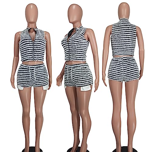 Drikio Summer Casual Women's 2 Piece Short Sets Zipper Up Sleeveless Tops and Shorts Set Stripe Fuzzy Sexy Two Piece Outfits
