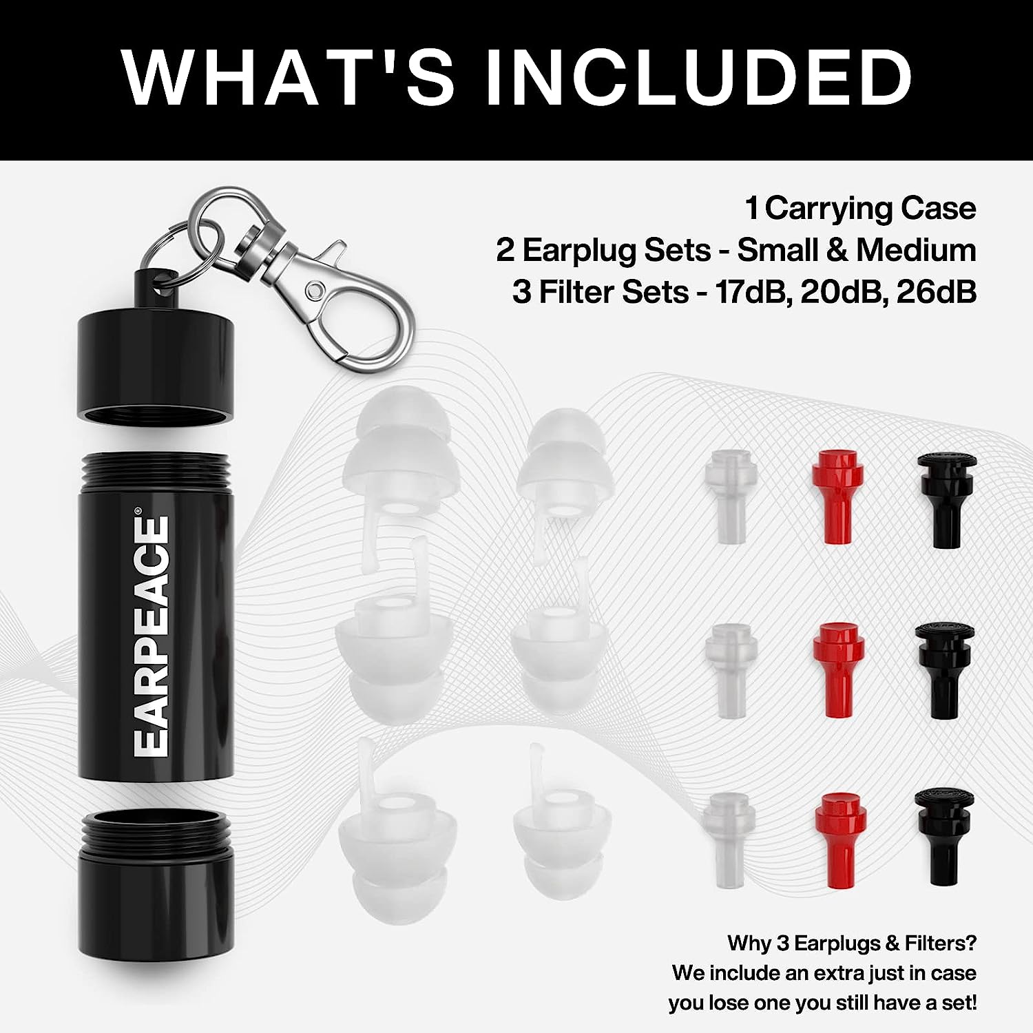 • MULTIPLE FILTERS & SIZES- Includes aluminum case, three interchangeable filter sets in Medium, High, and Max for noise reduction up to 26dB and both small and medium earplug sizes for a perfect fit.