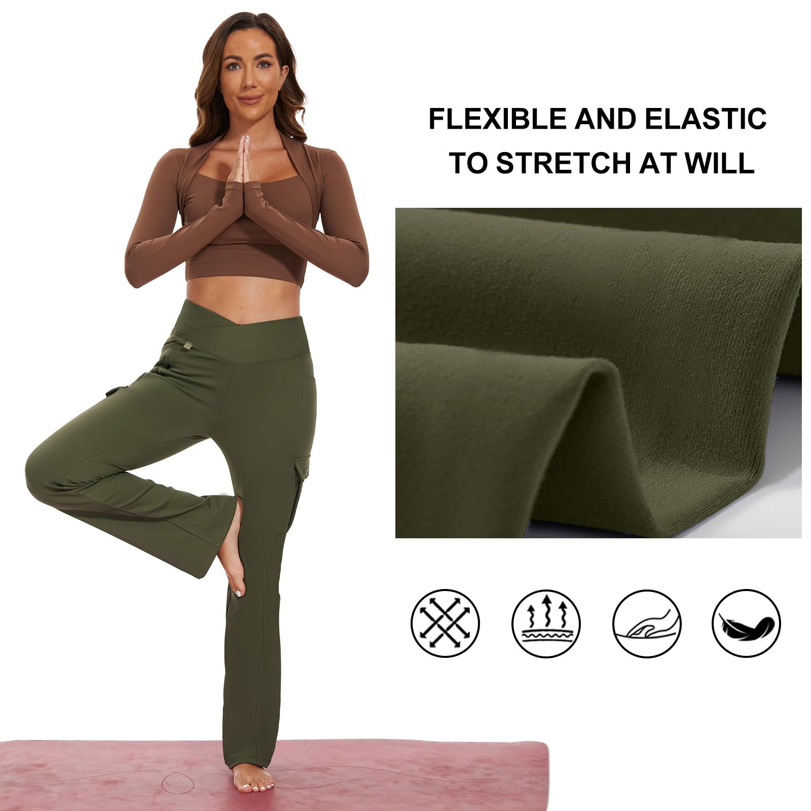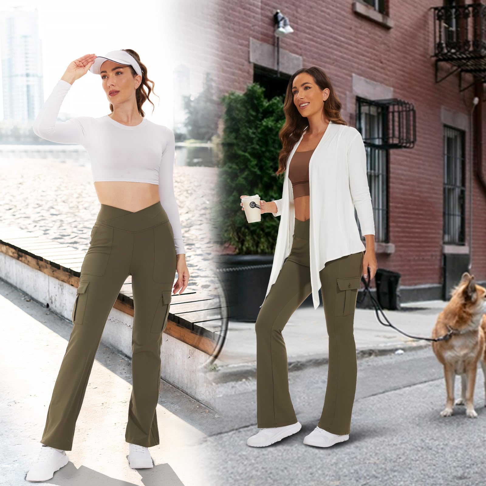 Flare Leggings for Women Yoga Crossover High Waist Pants with Tummy Control Workout Cargo with 5 Pockets Bootcut Leggings,Army Green(XL)