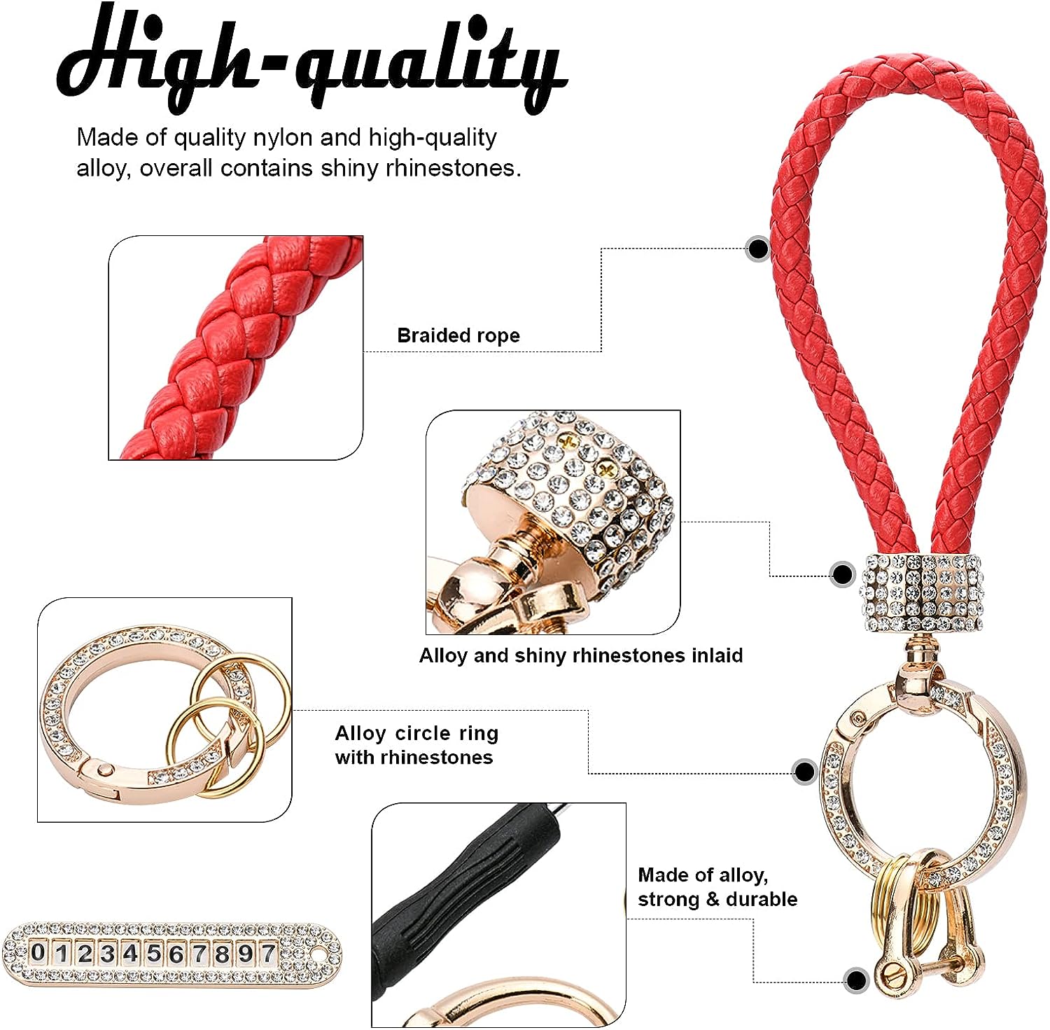 MUGVOLAX Anti-Lost car Keychains, Car KeyChain with Phone Number Car Keys, Leather Woven, Accessories With Bling Rhinestones