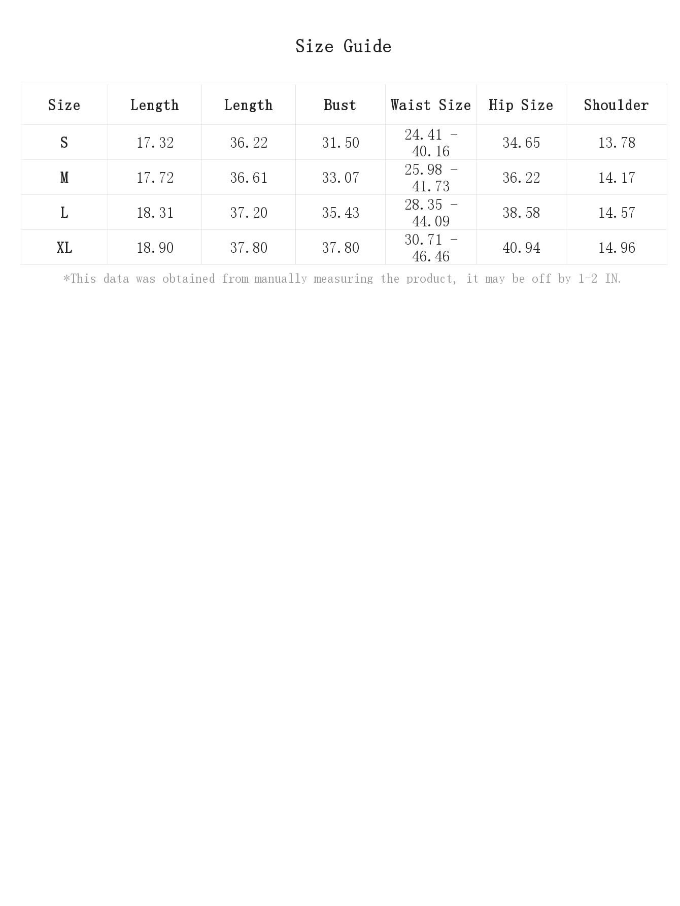 XL:Bust:37.8IN,Length:18.9IN,Shoulder:15.0IN,Hip Size:40.9IN,Length:37.8IN,Waist Size:30.7-46.5IN
