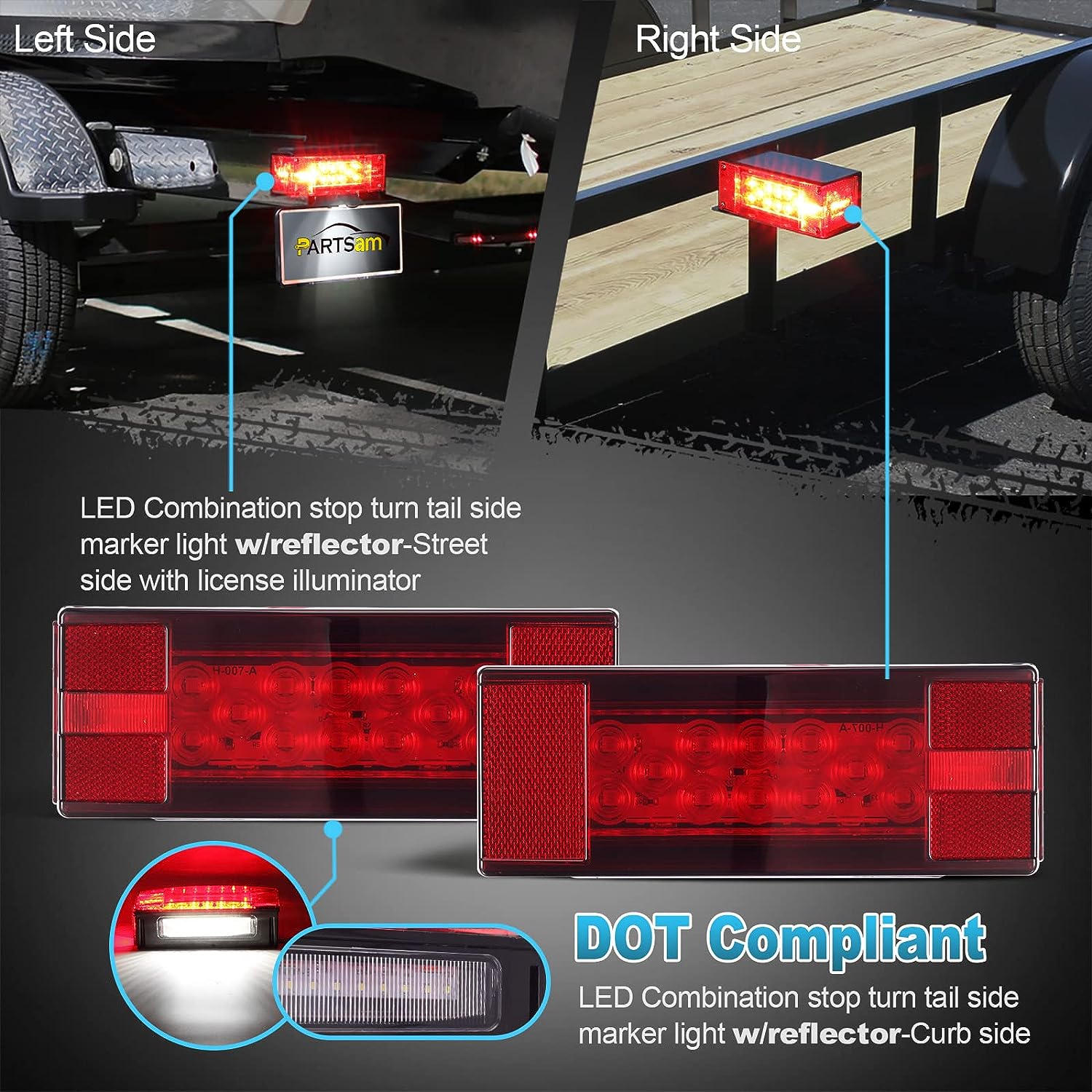 Partsam 12V LED Submersible Low Profile Rectangular Trailer Lights, Waterproof LED Combination Trailer Tail Light Kit Stop Brake License Plate Turn Running Lights Sealed for Boat Trailer Lights Truck