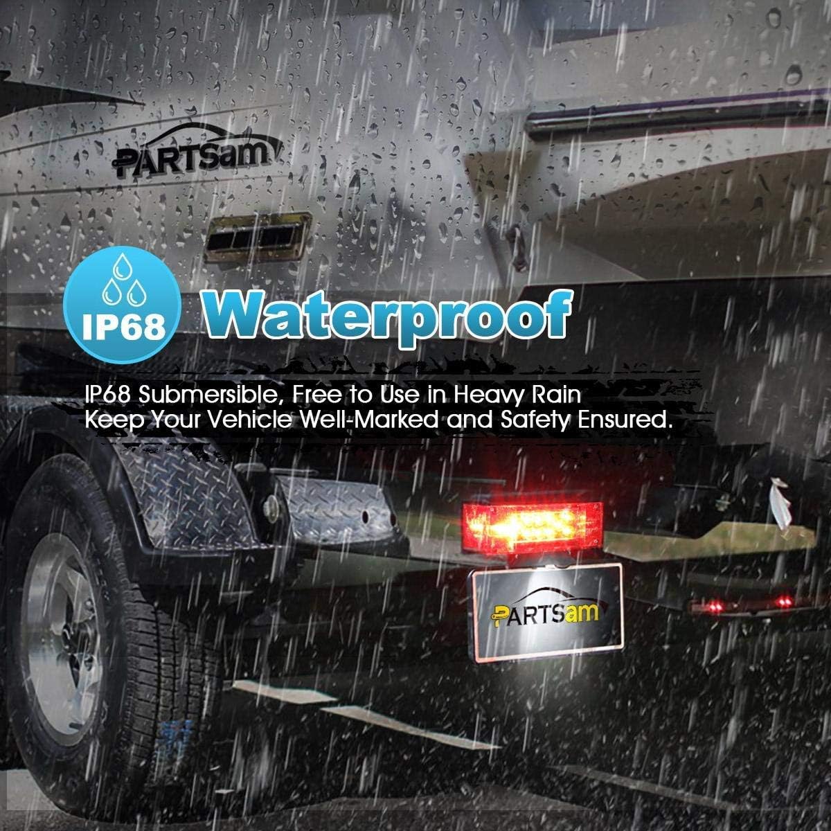 • DOT Compliant, IP68 Waterproof and Submersible(We Upgraded it this Year): There is no screw on the lamp shade, the LED trailer lights are completely welded together, The circuit board of tail light is seal. We have this tail light chipped in the center to prevent water to come in, thus, the water will flow into interlayer of the outer lens, but be prevented by the isolated chips. A drain hole is designed to pull out all the water. This is to guarantee that water will not damage the diodes or circuit board;