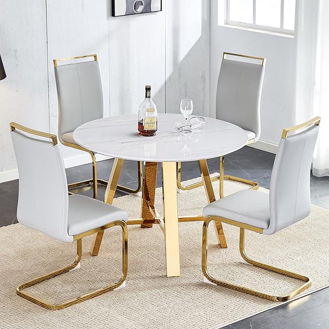 Round Dining Table Set for 4, 42" Marble Dining Table Set, Modern Kitchen Table and Chairs Set for 4, Luxury Marble Dining Table Set for 4, Space-Saving Dining Set of 4 for Dining Room, Coffee Room
