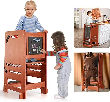 Toddler Tower Standing Stool - Montessori Learning Tower w/Activity Chalkboard & Non-Slip Foot - Toddler Step Stool for Bathroom Sink Kitchen Counter, Durable Wooden Step Stool for Toddlers