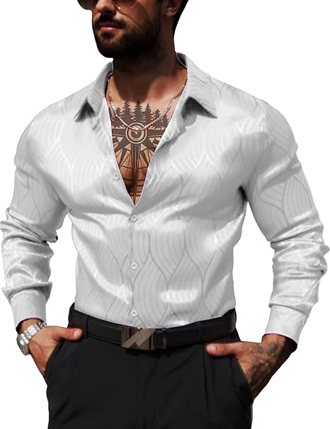Men Metallic Satin Dress Shirt Luxury Jacquard Long Sleeve Casual Button Down Shirts Silk Shirts