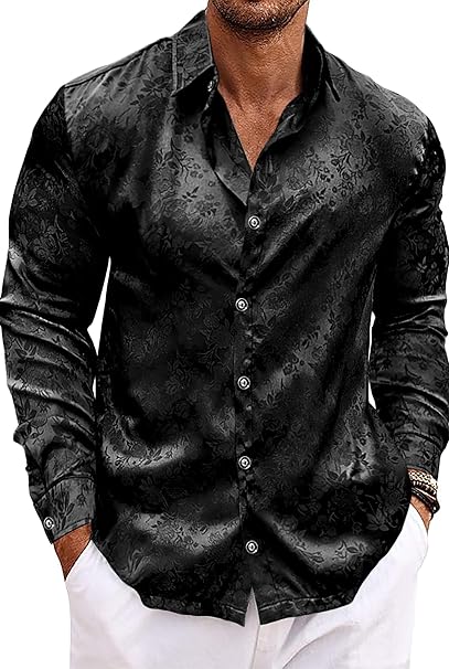 Men's Long Sleeve Dress Shirts Silk Floral Button Up Shirts Wedding Party Prom Jacquard Button Down Shirt S-3XL