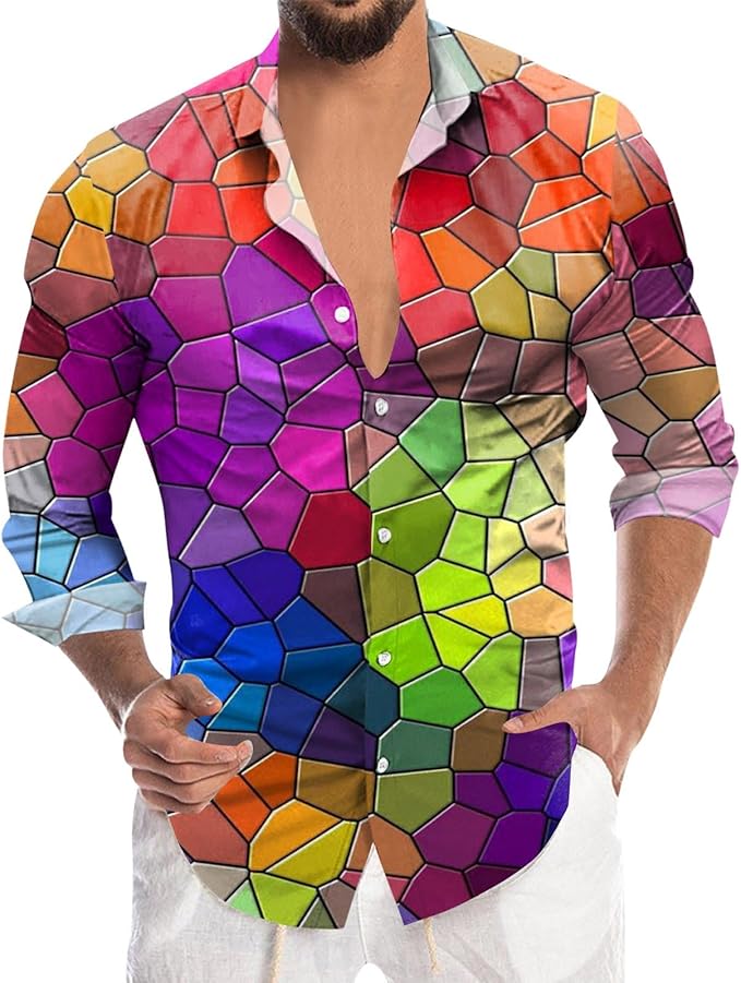 Mens Mardi Sequin Fashion Digital 3D Printed Long Sleeve Lapel Button Down Shirt Top Work Short (Red-4, M)