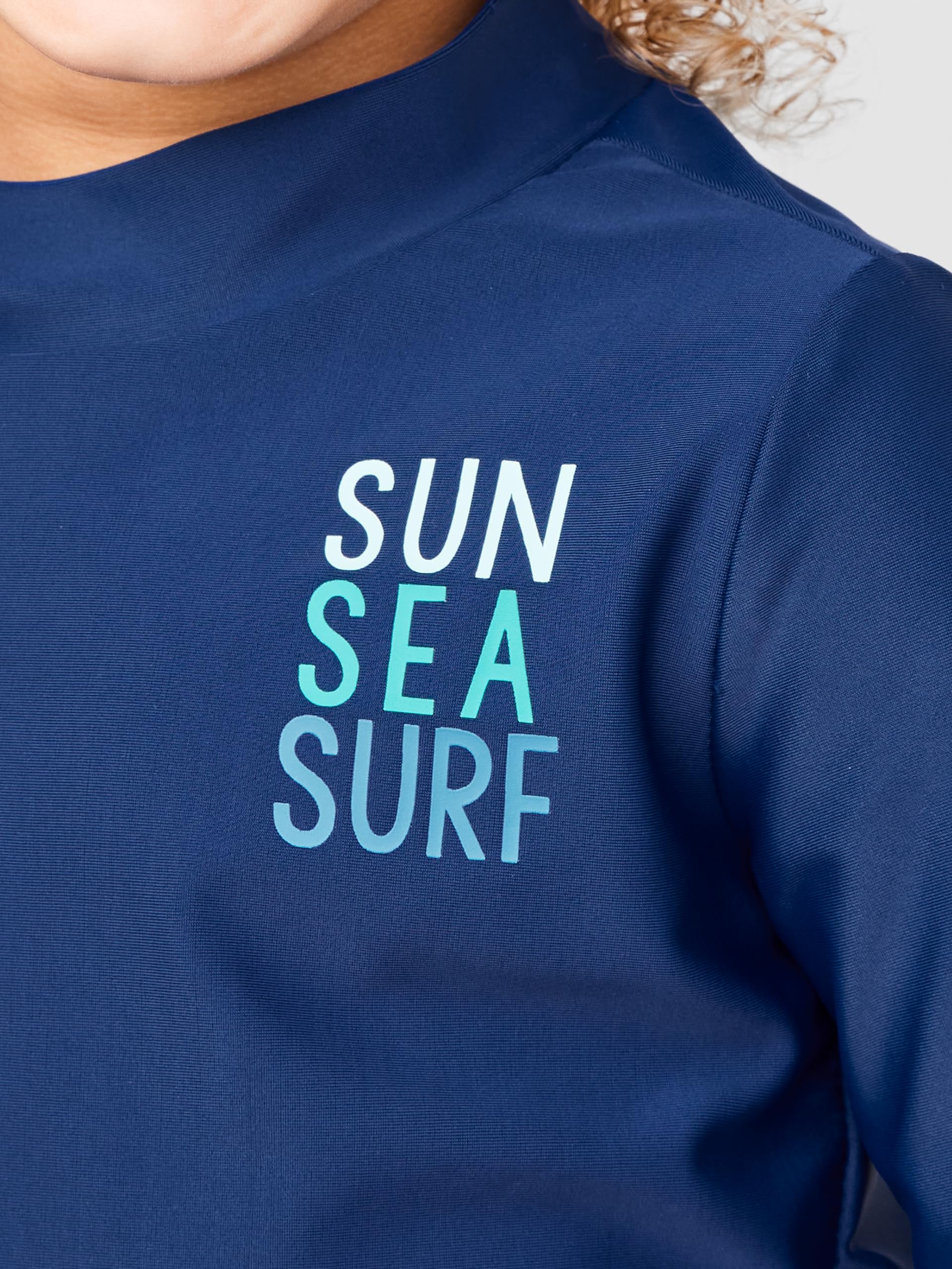 Details: Matching rash guard and swim trunk in fun colors and prints
