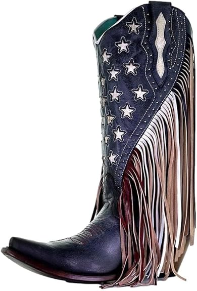 Corral Boots Women's Navy Blue Lamb Stars Inlay & Studs & Fringes Western Cowhide 13" Shaft Snip Toe Cowgirl Boots
