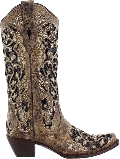 CORRAL LADIE'S BROWN INLAY & FLOWERED EMBROIDERY & STUDS & CRYSTALS, SNIP TOE, LEATHER SOLE, WESTERN, A3569