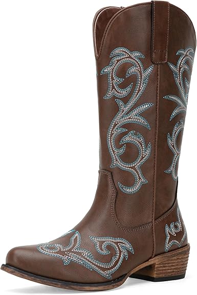 Jeossy 9808 Cowboy Boots for Women, Round Toe Cowgirl Boots Women, Western Embroidered Mid High Wide Calf Chunky Pull on Boot for Girls with Inside Zipper