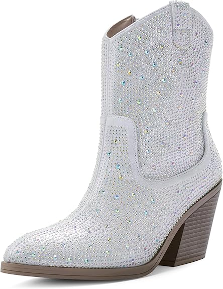Modatope Rhinestone Cowboy Boots for Women Sparkly Cowgirl Ankle Boots Chunky Heel Side Zipper Womens Boots