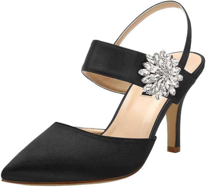 ERIJUNOR Mid Heel Shoes for Women Pointed Toe Slingback Rhinestone Brooch Satin Dress Pumps Evening Prom Wedding Shoes