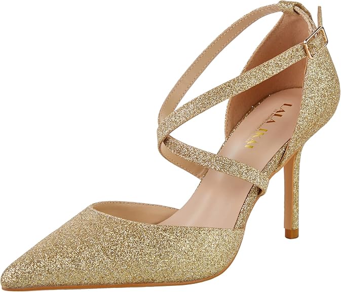 LALA IKAI Women Pumps, Pointed Toe High Heels Glitter Pumps Strappy Cross Ankle Strap Shoes for Casual Work Wedding Evening Party Dress