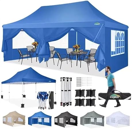 COBIZI 10x20 Pop up Canopy with 6 Removable Sidewalls, Outdoor Canopy Tents for Partie Wedding, Instant Sun Protection Shelter with Upgrade Raised Roof and Carry Bag, with Extra 4 Sandbags__‚Blue