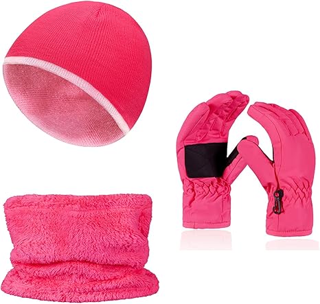 Kids Skiing Snow Winter Gloves Teddy Fleece Scarf Hat Cute Beanie Gloves Neck Warmer for Cold Weather