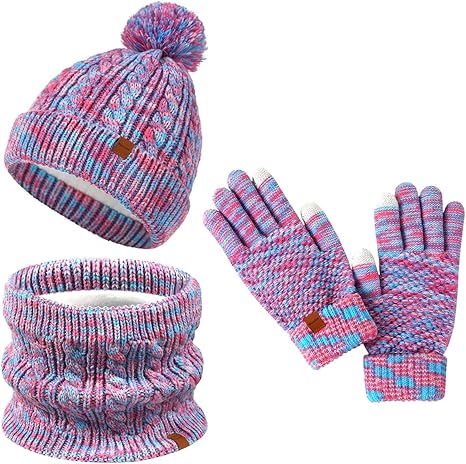 Kids Winter Hat Gloves Scarf Set, Girls Boys Children Hats Beanie with Pom Knit Neck Warmer Gaiter Mittens Fleece Lined Set