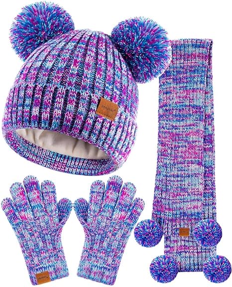 Kids Winter Hat Gloves Scarf Set, Girls Toddler Children Beanie with Pom Knit Neck Warmer Gaiter Mittens Fleece Lined Set